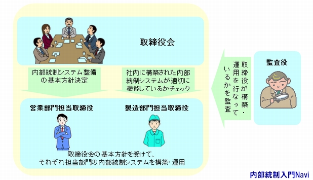 内部統制システムの構築義務 大会社(資本金が5億円以上または、負債の合計が200億円以上の会社)や委員会設置会社では、内部統制システムの構築に関する決定が義務付けられています。すなわち、大会社である取締役会設置会社では、取締役会が内部統制システムの整備に関する事項(会社法362条四号六号)を決定する義務を負います。 内部統制システム整備の具体的な水準については、各企業の判断に委ねられていますが、企業不祥事の未然防止等を図り、ひいては企業価値を向上されるため、それぞれの会社の実態・特性に適したコーポレートガバナンス・リスクマネジメント・内部統制を自主的に構築していくことが必要とされています。 内部統制での経営陣の関係 会社法では、取締役会が内部統制システムの整備についての基本方針を決定し、その取締役会の基本方針の決定を受けて、営業部門や製造部門などの業務を担当する各取締役が、それぞれの担当部門の内部統制システムを構築・運用を行ないます。