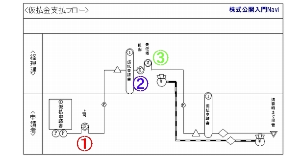 すべてにおいて、次のような整合性の確認が必要になる。 @マニュアルに申請者は「上司等に承認を得る」とあるので、フローでも承認を得る作業があり、帳票においても上司決裁印を得る欄がなければならない。 A小口担当者はマニュアルにある「必要事項が記載された仮払い申請書」の確認を行う作業がフロー上にあり、帳票に作業済み印欄がなければならない。 Bマニュアルに「小口責任者の承認」とあるので、フローでも承認を得る作業があり、帳票においても責任者(課長)決裁印を得る欄がなければならない。 |