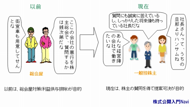 株主総会での獲得目的株主総会の運営準備をするにあたり、まず株主総会での獲得目的を認識しておく必要があります。なぜなら運営準備において、『その獲得目的を獲得するためにはどうするか』が、準備作業での判断基準となるからです。 株主総会での獲得目的も、市場や社会情勢の変化と共に移り、以前は、『総会屋への利益供与や総会での暴力などの排除』を目的とし、『会社提案議案の可決』は目的として重要視されていませんでした。しかしながら近年は、総会社もほとんど数えるほどしか居なくなりましたが、逆に会社提案が否決されることが多くなりました。